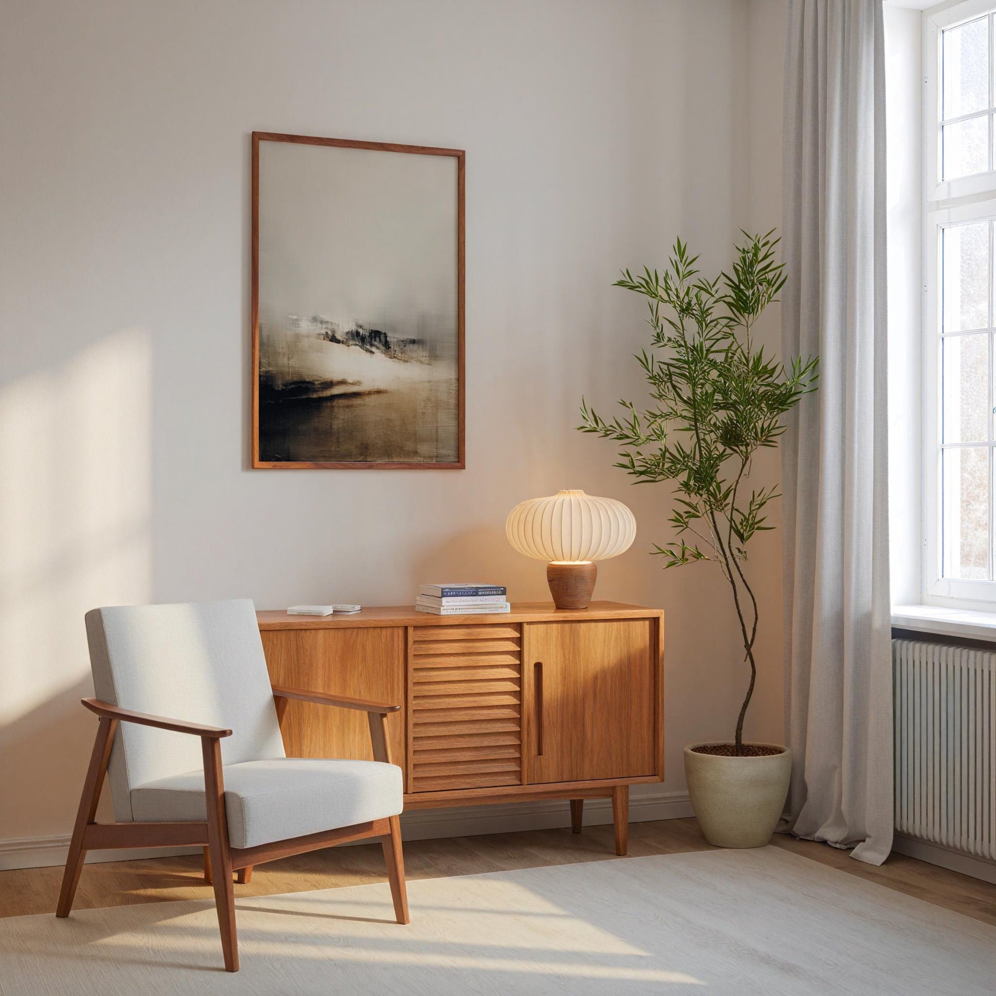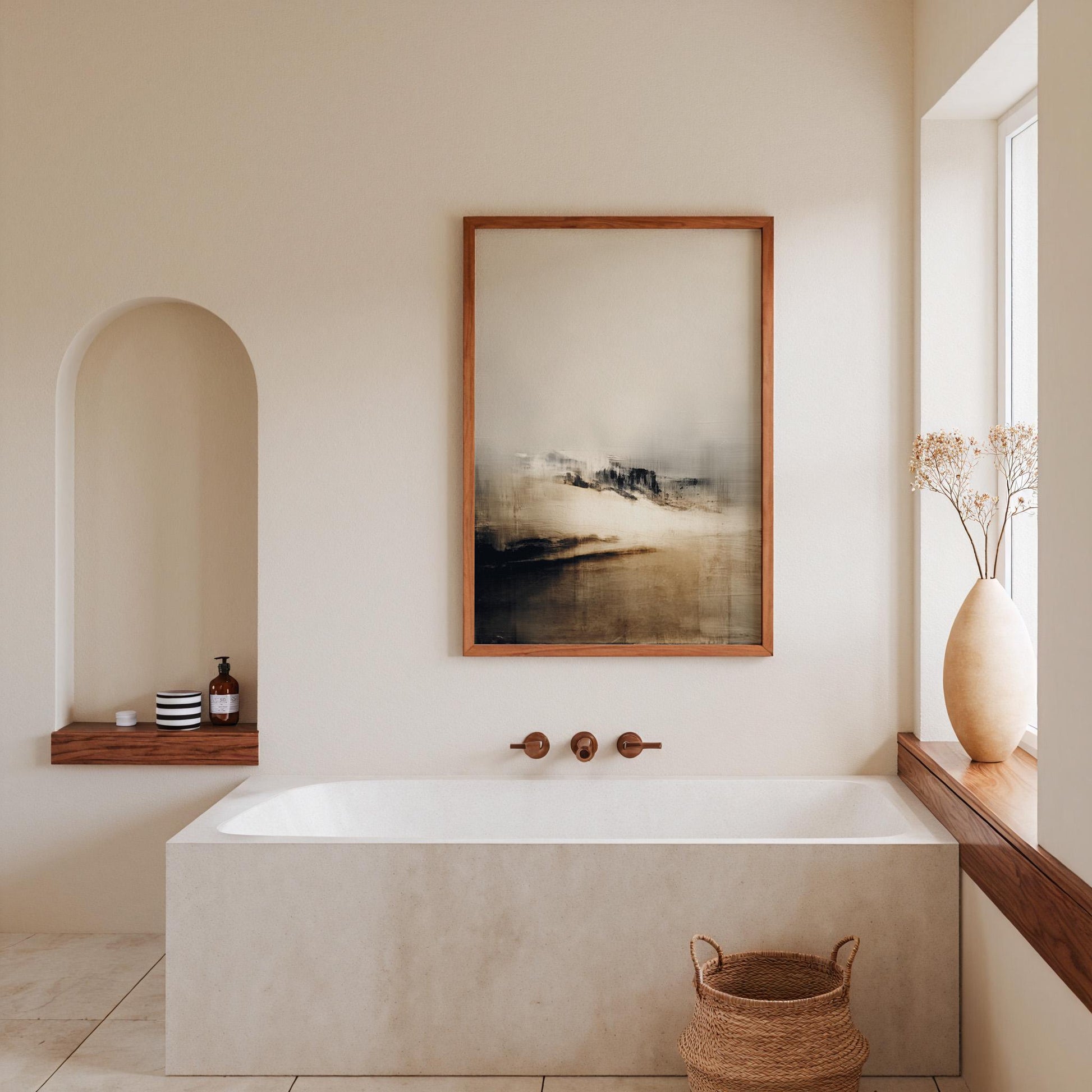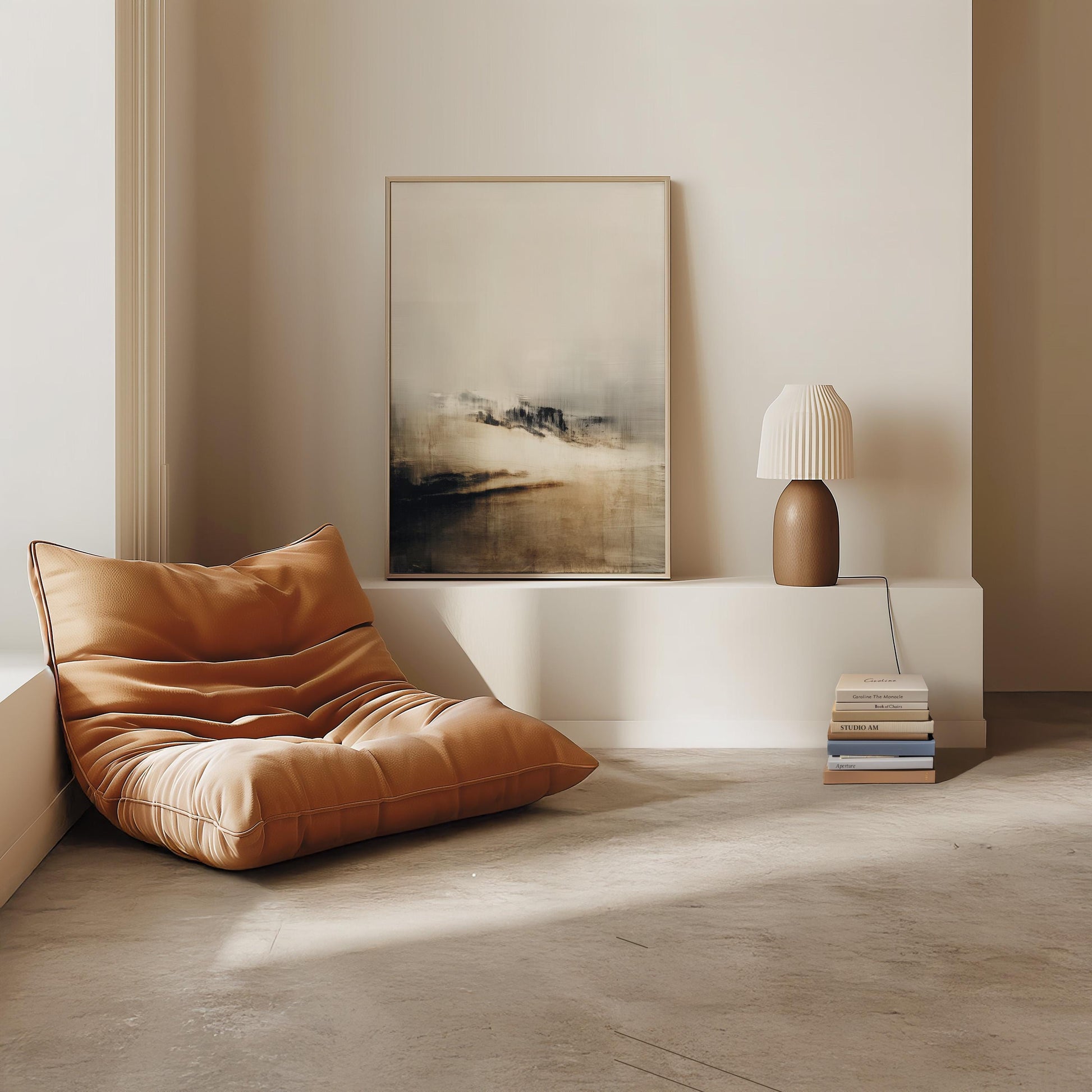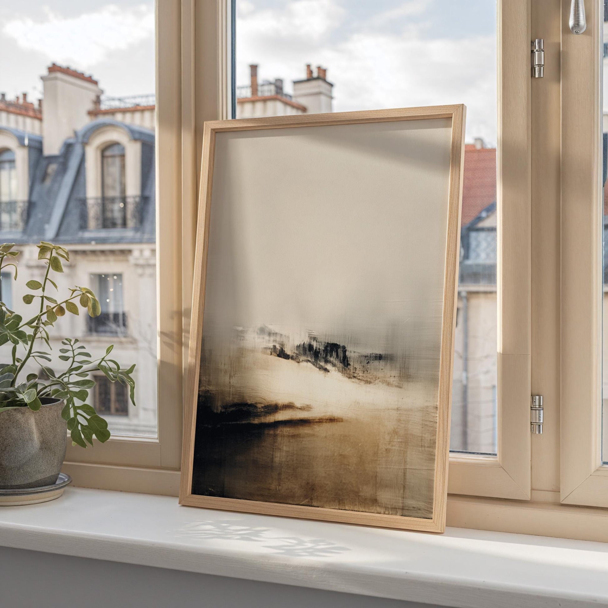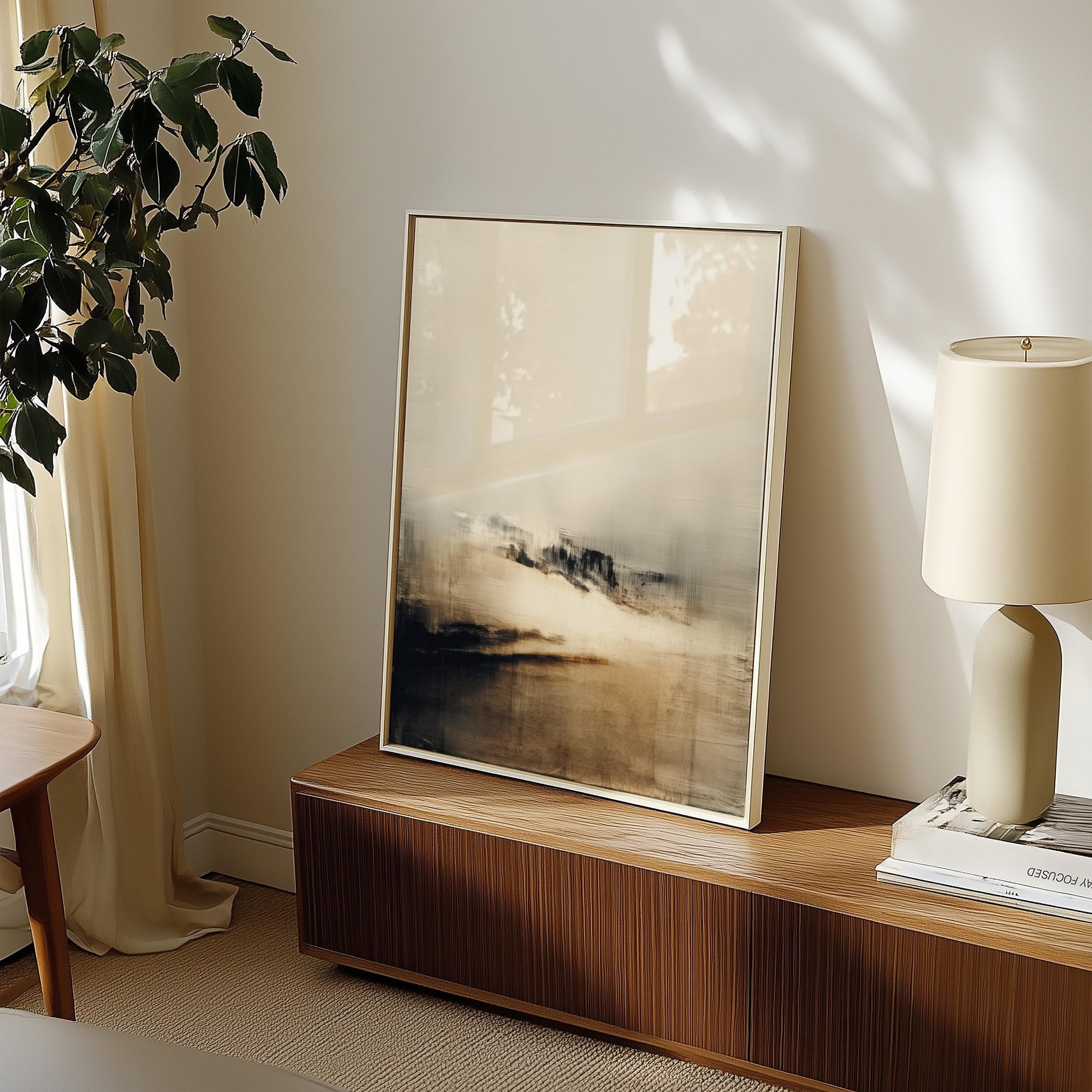 This abstract lake landscape print brings calm, atmospheric beauty to modern homes. The minimalist composition features soft earth tones and organic shapes that work in contemporary spaces.