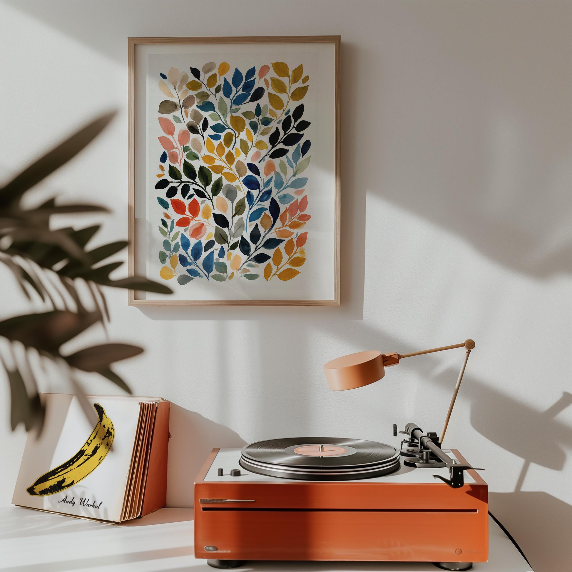 What makes this watercolour leaf art special is its dynamic asymmetrical layout that mimics how leaves naturally fall and overlap whilst the rich colour palette brings warmth and sophistication to any space. The contemporary botanical print works beautifully as a statement piece that celebrates natural forms through artistic interpretation.