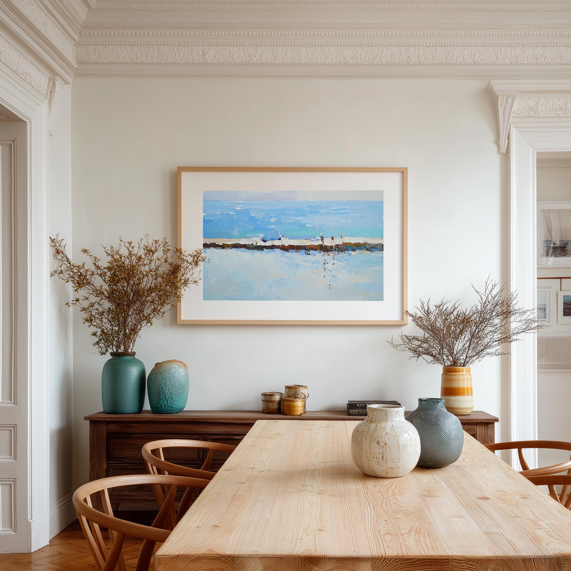 Perfect for creating a serene focal point, this print works beautifully in living rooms, bedrooms, hallways, or home offices. Its layered brushstrokes and fresh, airy colours complement coastal, minimalist, and modern interiors, helping you bring a sense of calm and open space into your home.