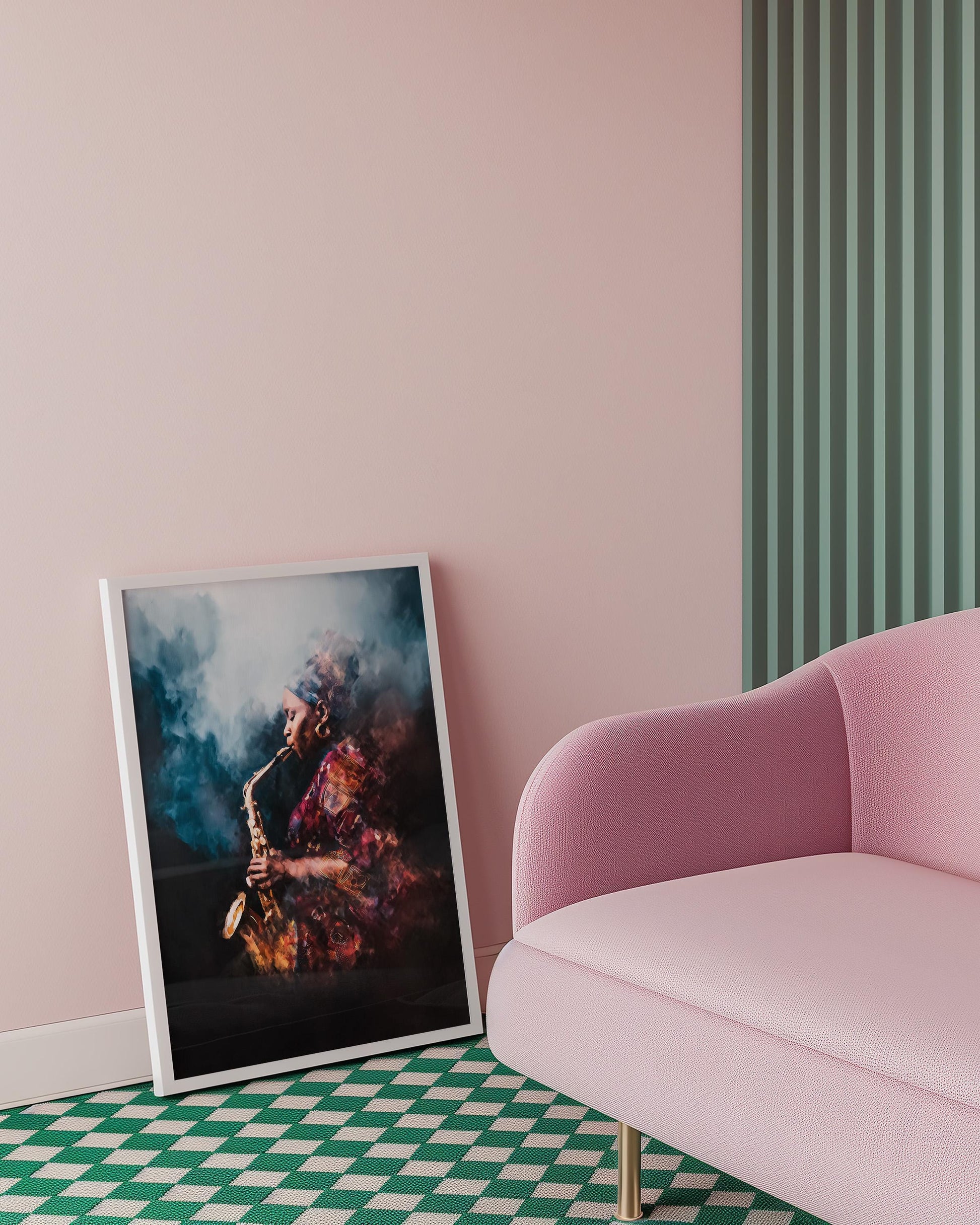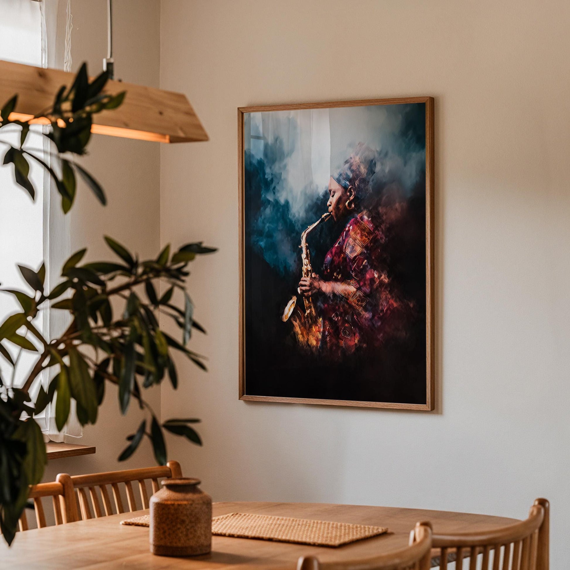 Music Rooms Perfect tribute for jazz enthusiasts and saxophone players Living Areas Creates a sophisticated focal point for music lovers Studios Inspiring artwork for creative spaces and practice rooms Bedrooms Atmospheric piece for fans of jazz and musical art
