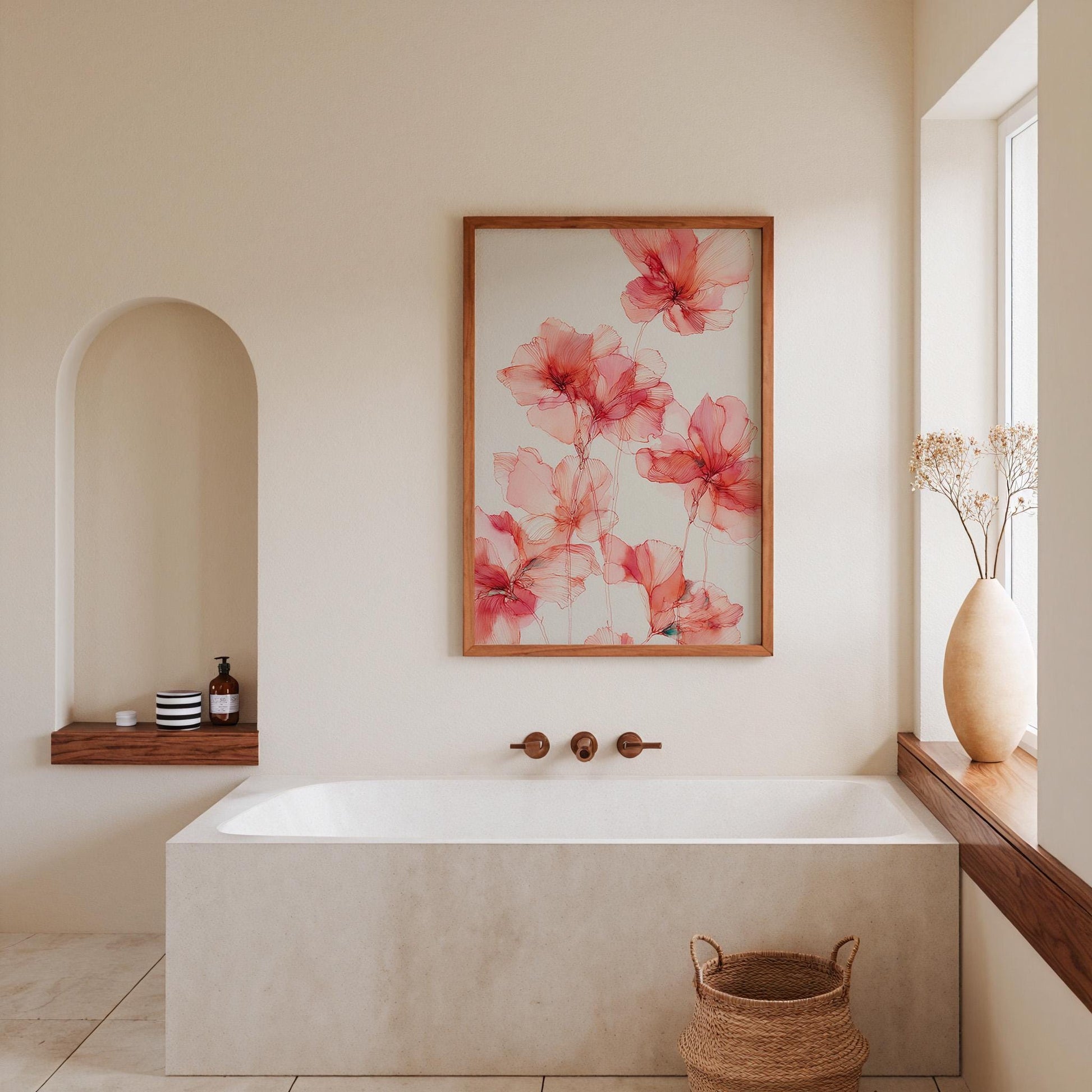 This flower wall art complements botanical themed home decor beautifully and works equally well in bedrooms bathrooms or anywhere you want to create a calm sophisticated atmosphere. The versatile pink colour scheme pairs with both neutral and bold interior palettes making it an excellent choice for most decorating styles.