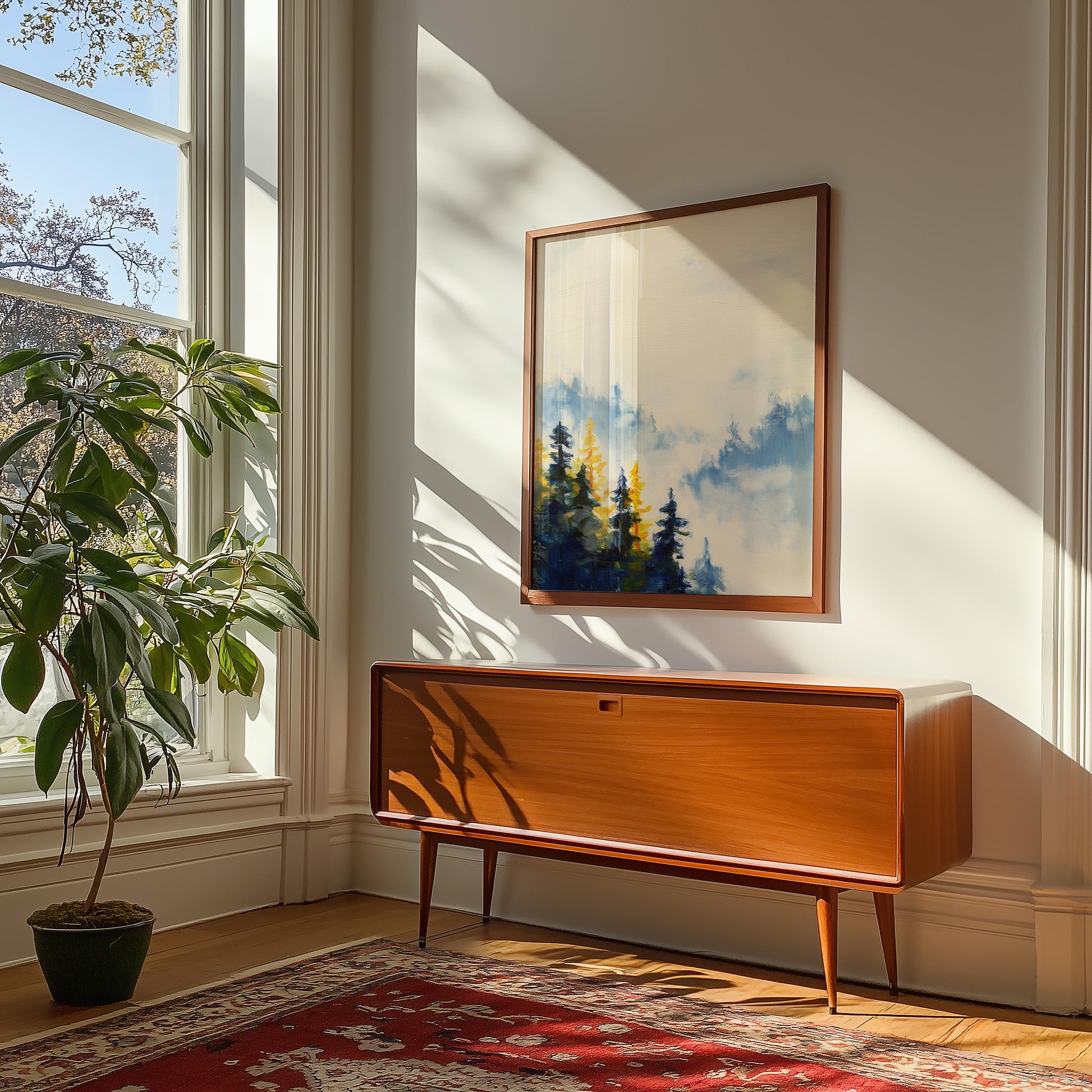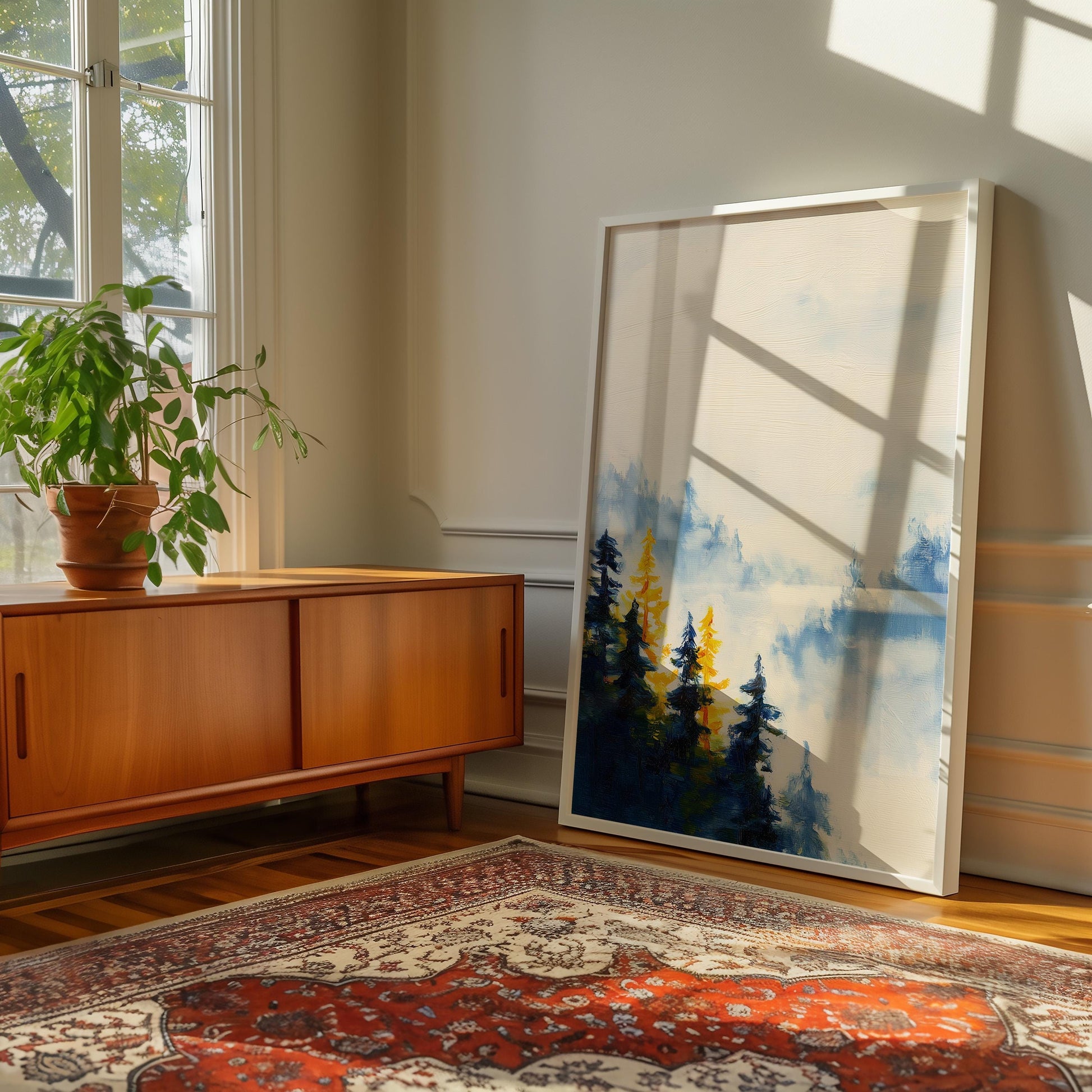 This misty forest art print complements nature-themed décor beautifully, pairing effortlessly with both contemporary and traditional interiors. Its muted blue and golden tones harmonise with warm wood, soft neutrals, or minimalist palettes, making it suitable for any season or style.