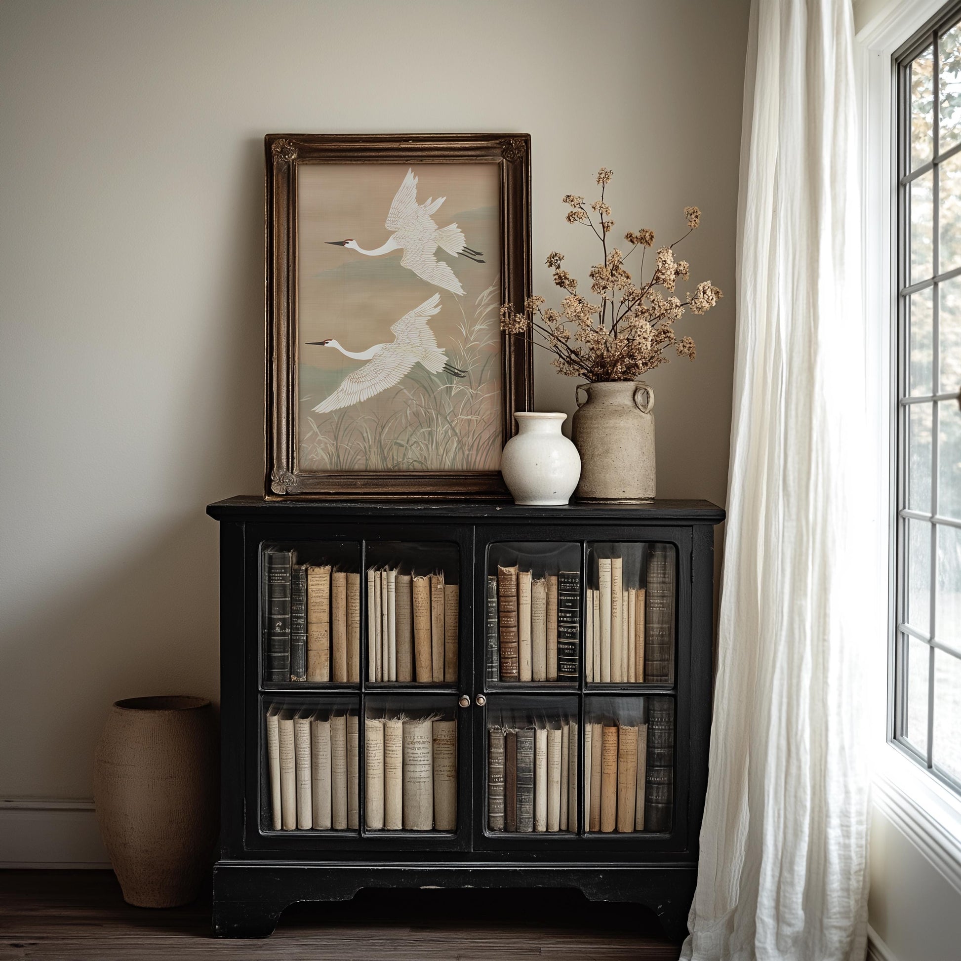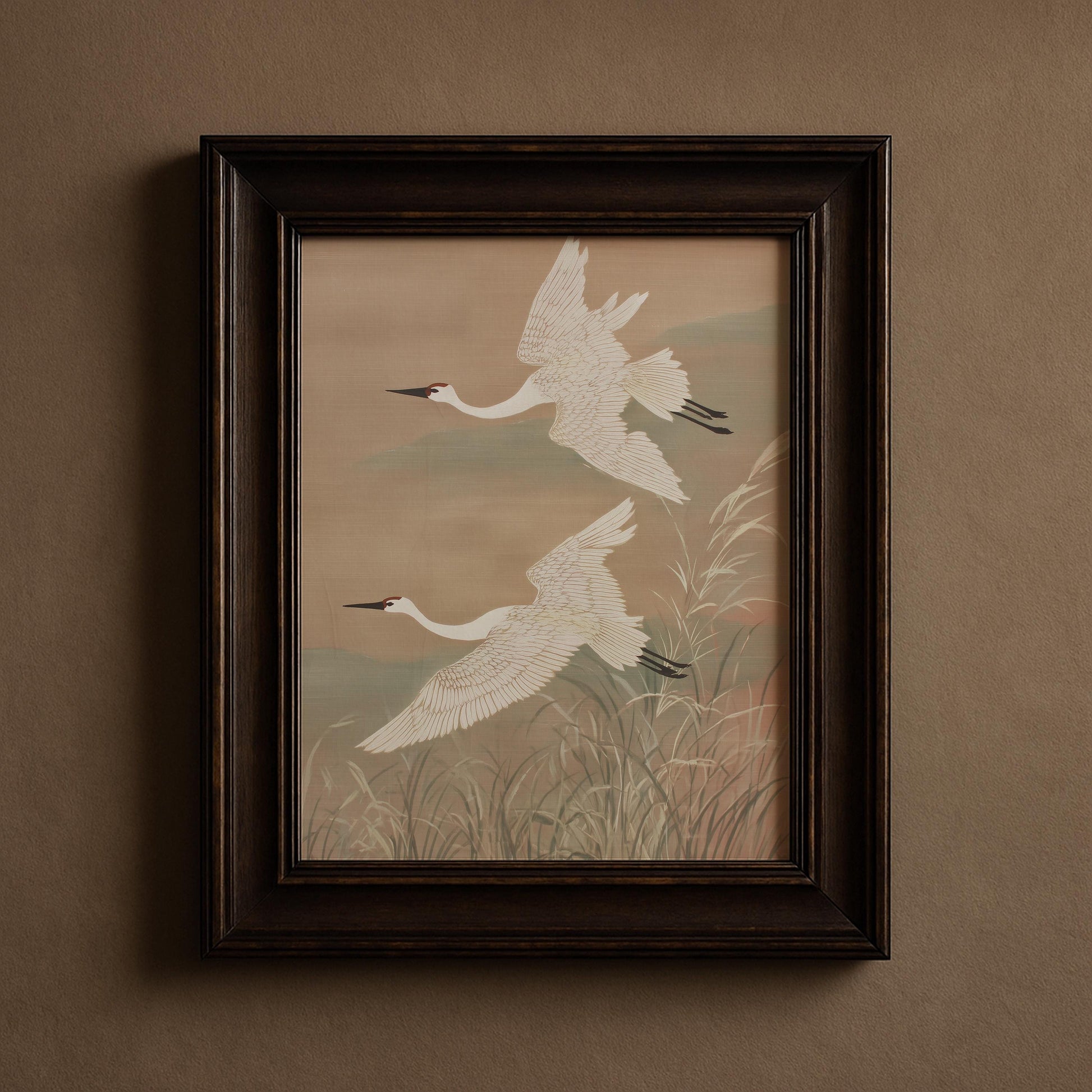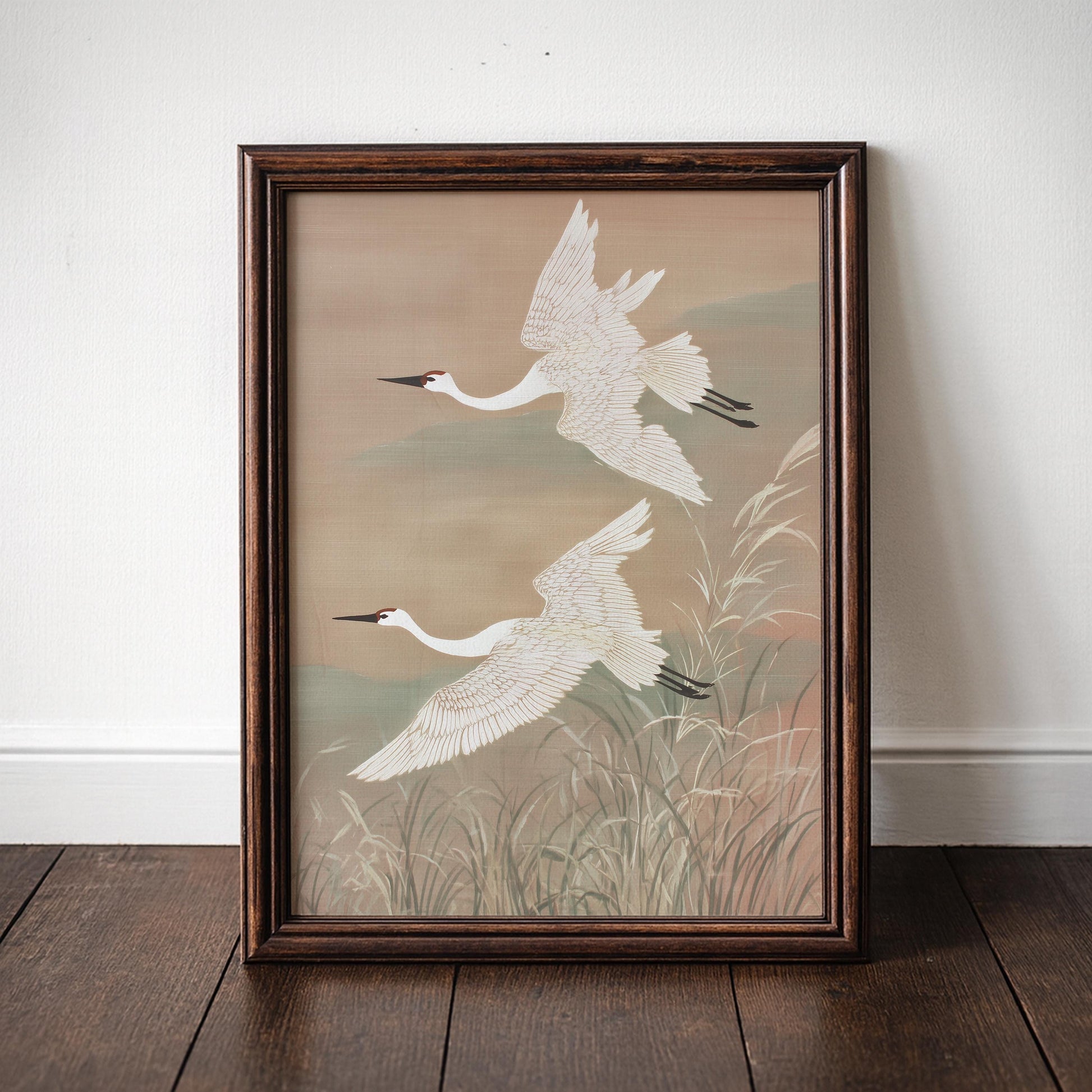 Two Japanese cranes soar gracefully through soft skies above wetland grasses in this dynamic Asian bird art. The neutral beige and sage palette creates elegant movement perfect for Japandi and zen inspired interiors.
