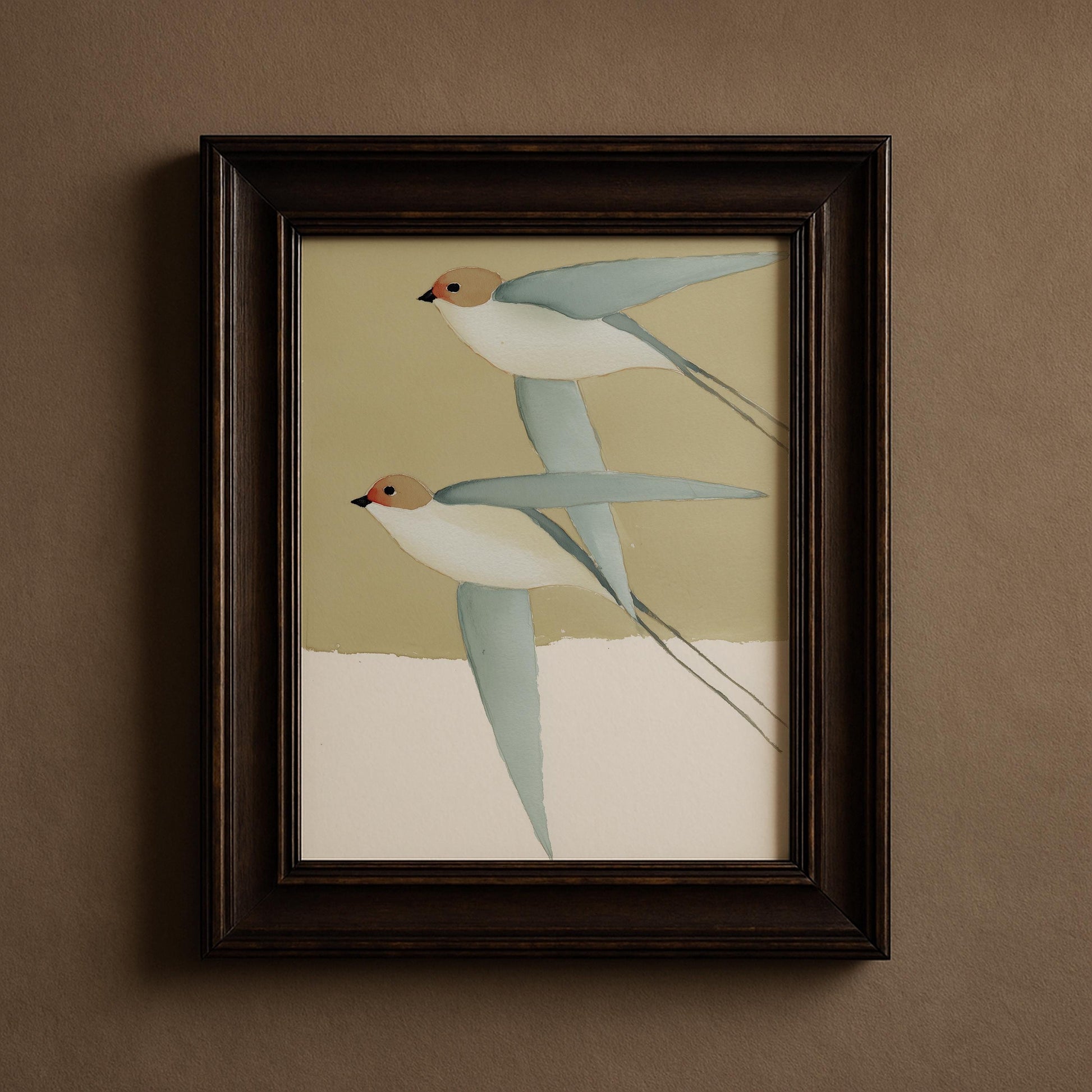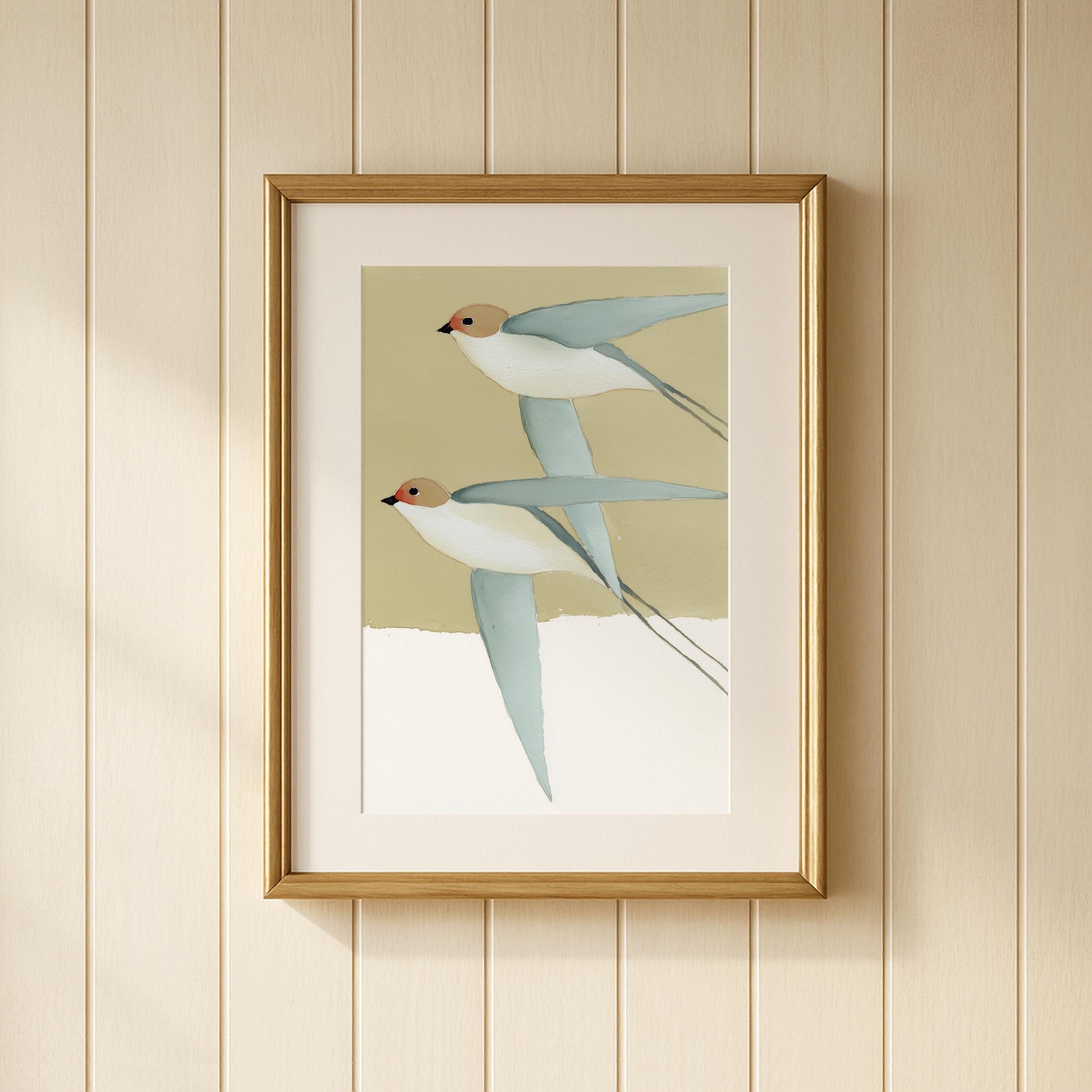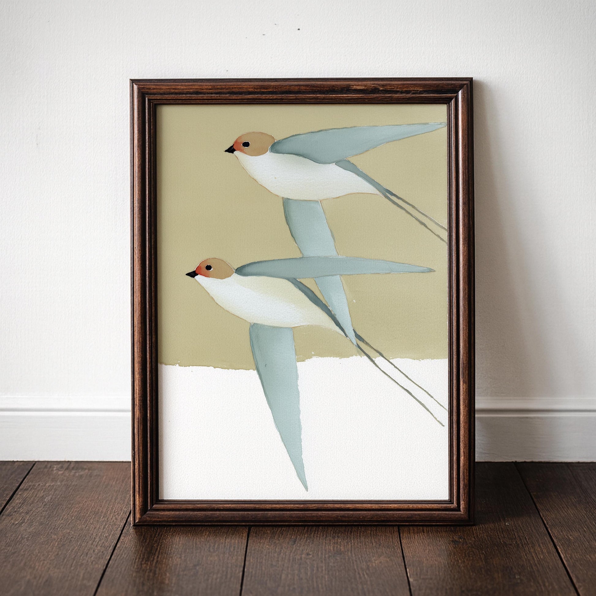 Two swallows captured mid flight in this minimalist bird print. The soft beige and blue palette creates contemporary wildlife art perfect for modern nature inspired interiors.