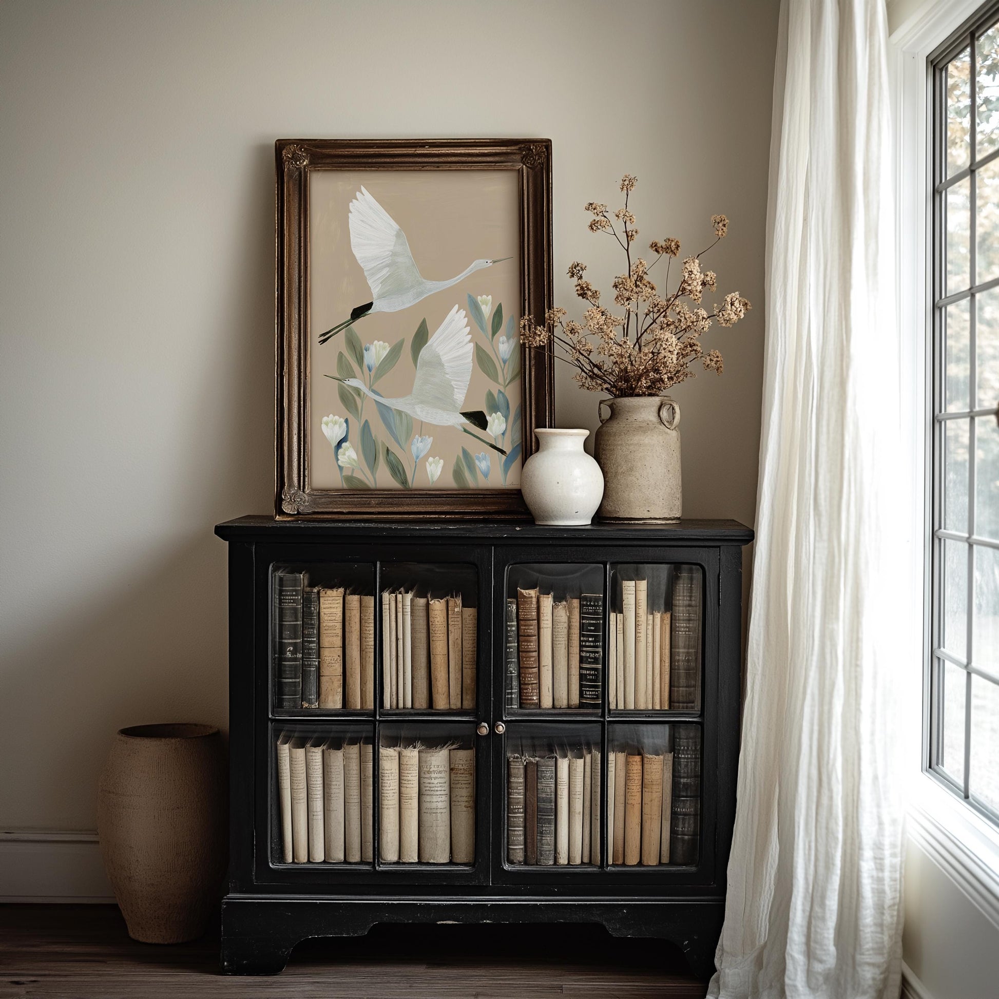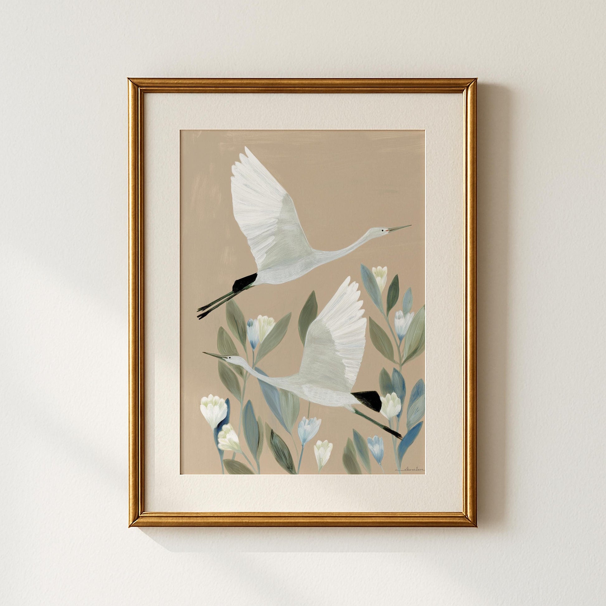 Two elegant Japanese cranes soar gracefully among delicate white blossoms in this serene Asian bird print. The soft beige and blue palette creates sophisticated wall art perfect for japandi and zen inspired interiors.