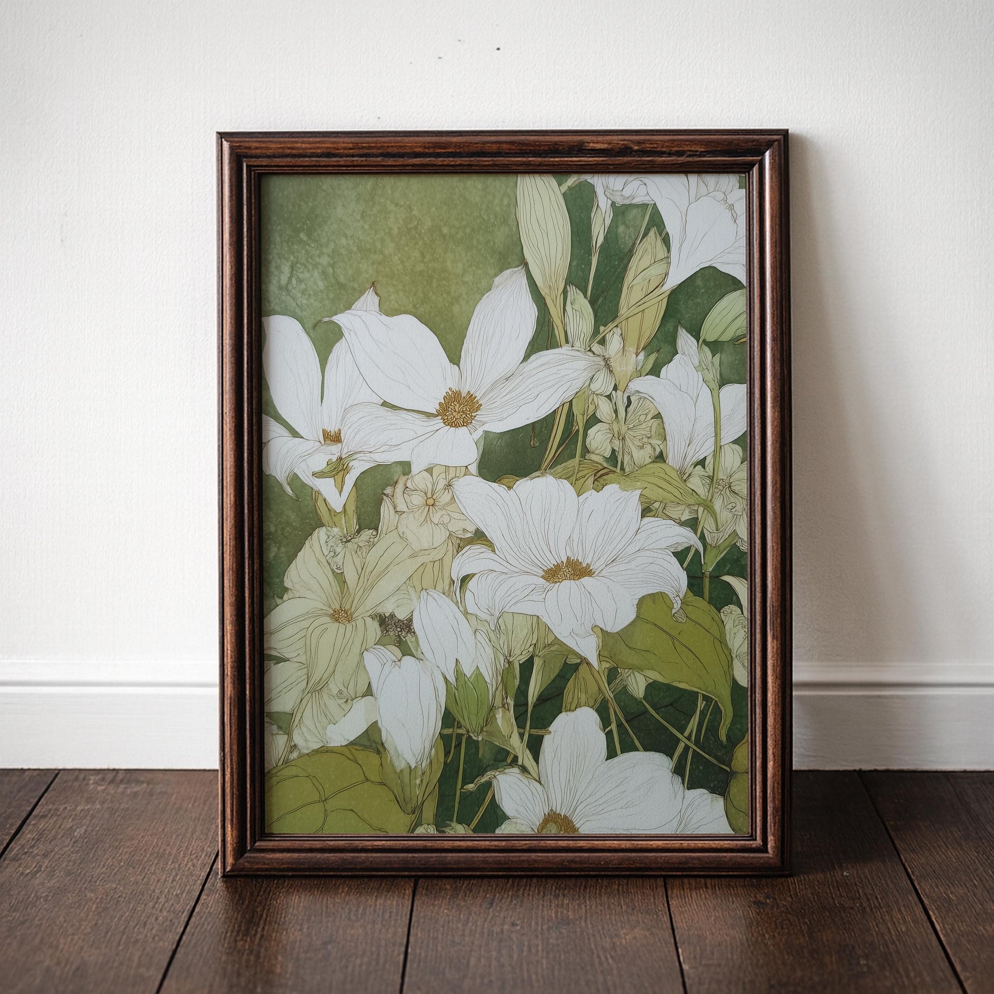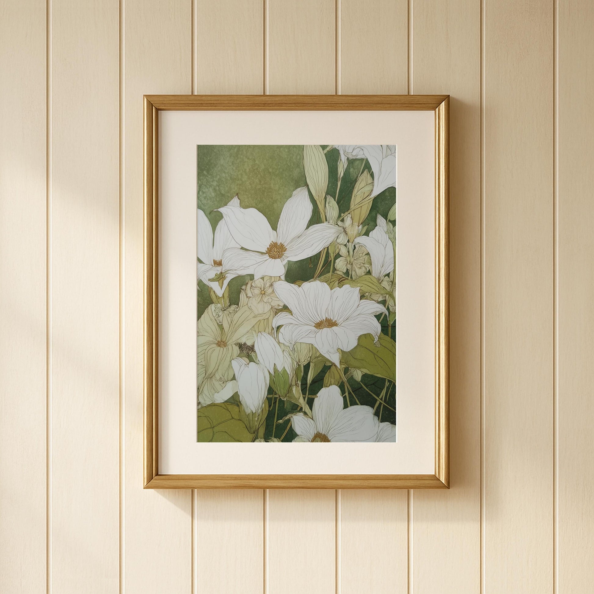 This Japanese flower print combines traditional botanical illustration techniques with contemporary minimalist aesthetic. White clematis blooms with detailed golden centres are rendered with precision, while varying shades of sage and olive green leaves add depth and natural beauty.