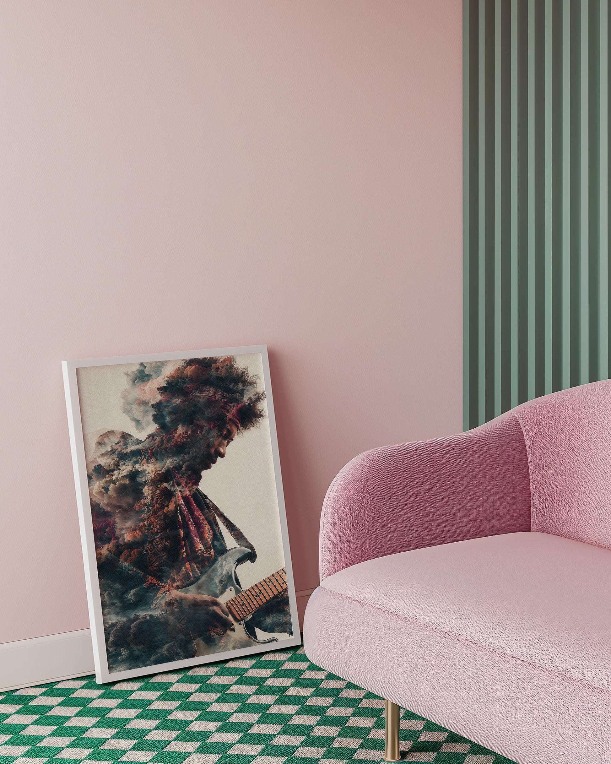 A captivating statement piece for music lovers, guitar enthusiasts, and fans of psychedelic art, this design bridges visual art and musical legend in a timeless, imaginative way.