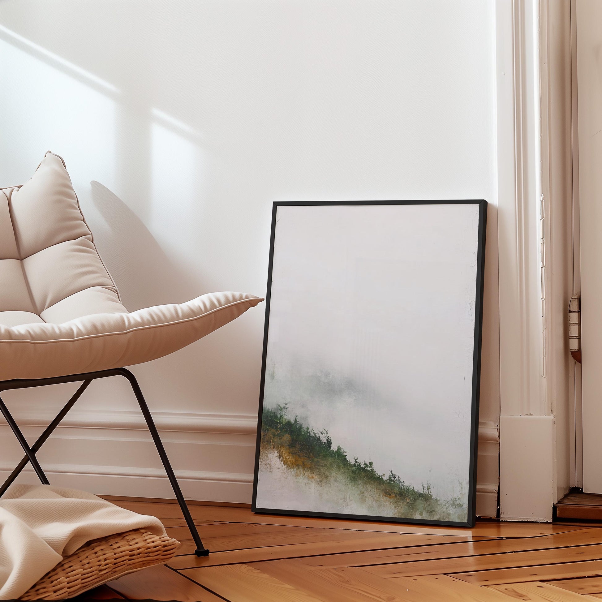The composition uses asymmetrical placement to create visual intrigue whilst the negative space emphasizes the vast misty quality of hillside landscapes perfect for bringing serene natural beauty into modern interiors.
