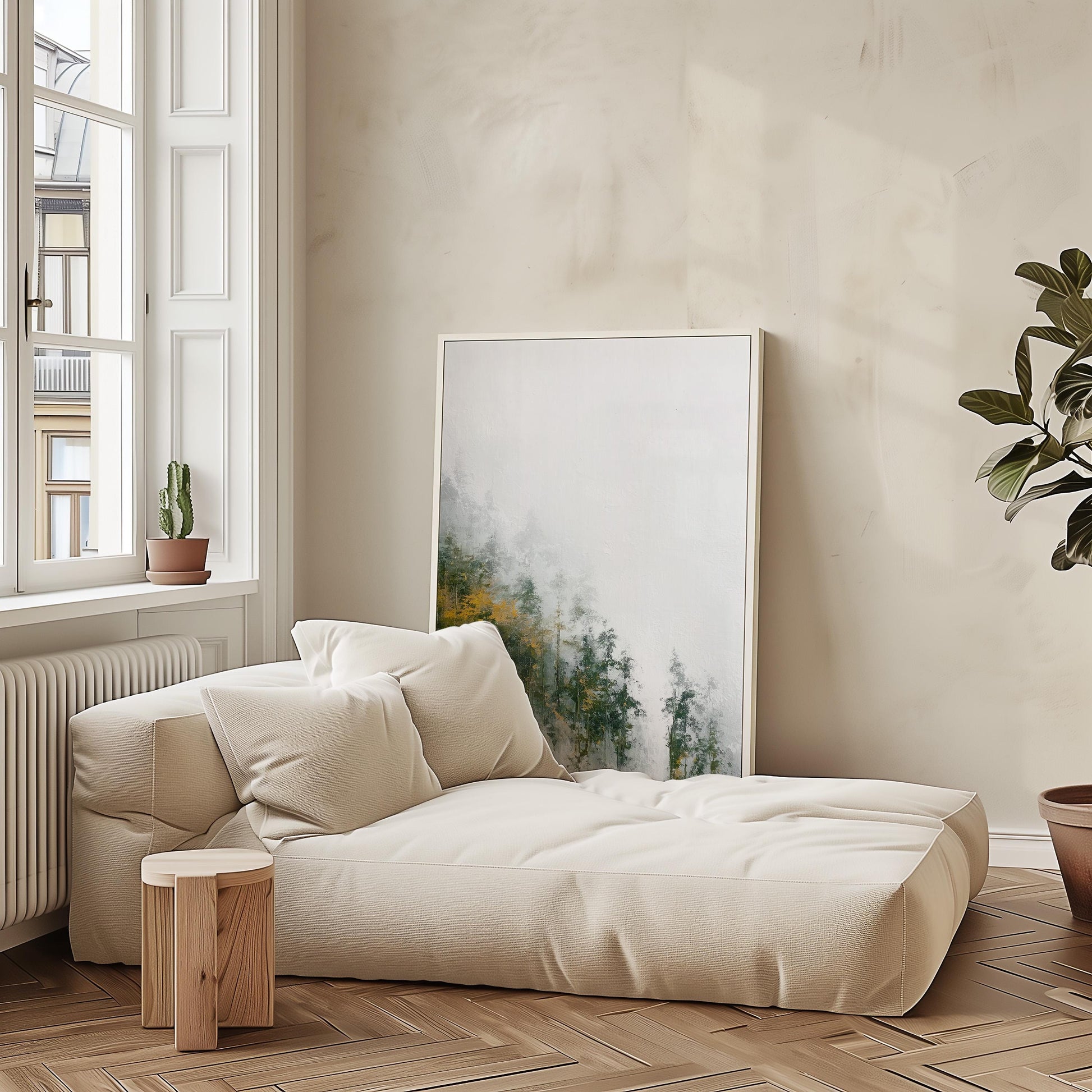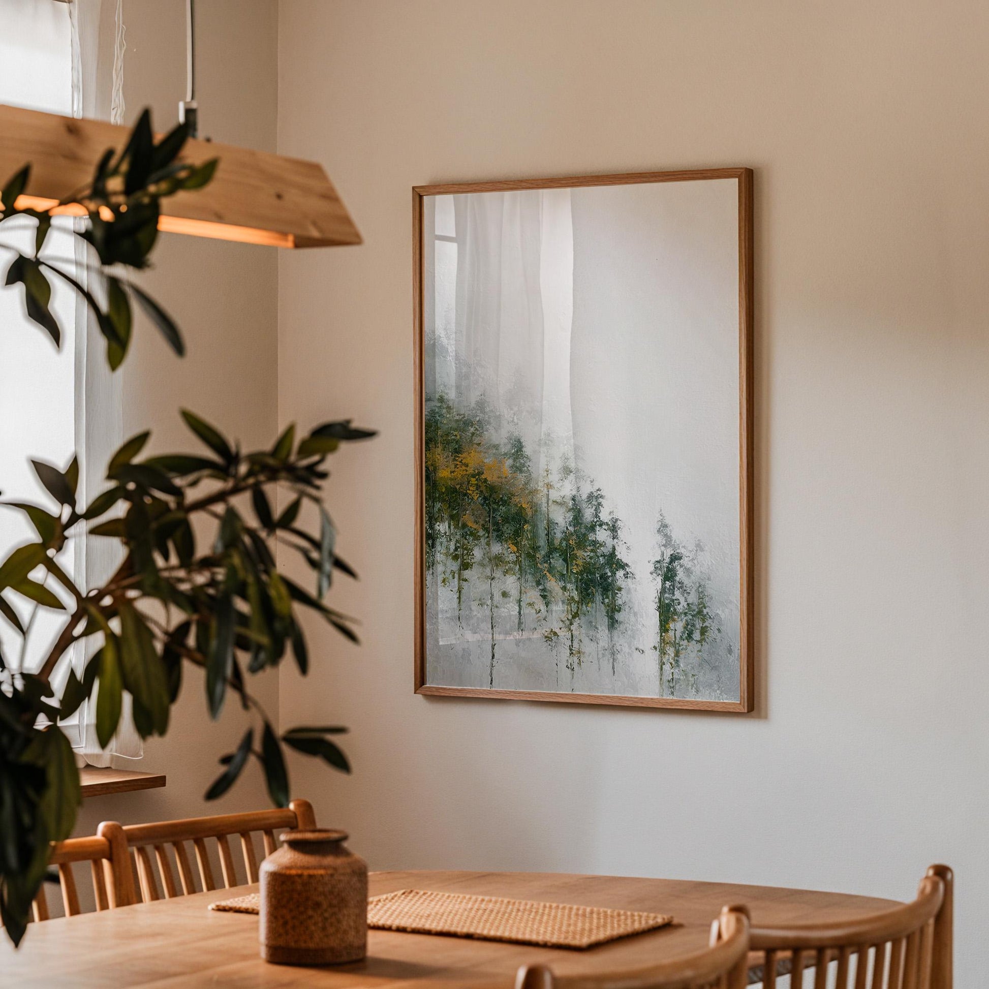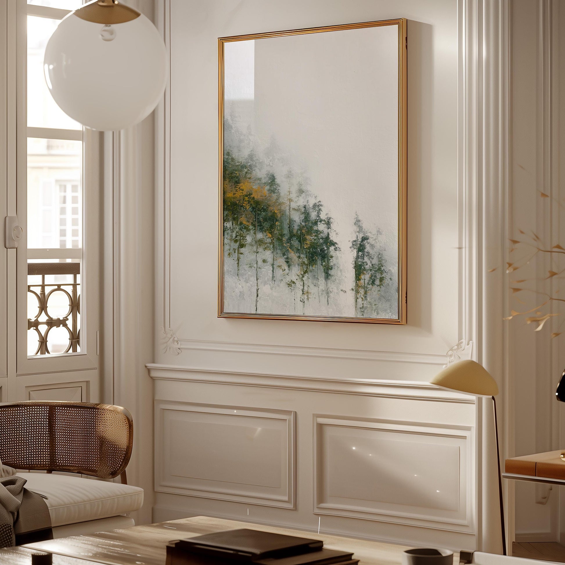 The composition balances painted forest elements dissolving into mountain mist whilst the negative space emphasizes the vast atmospheric quality of high altitude landscapes perfect for bringing serene mountain beauty into interior spaces.