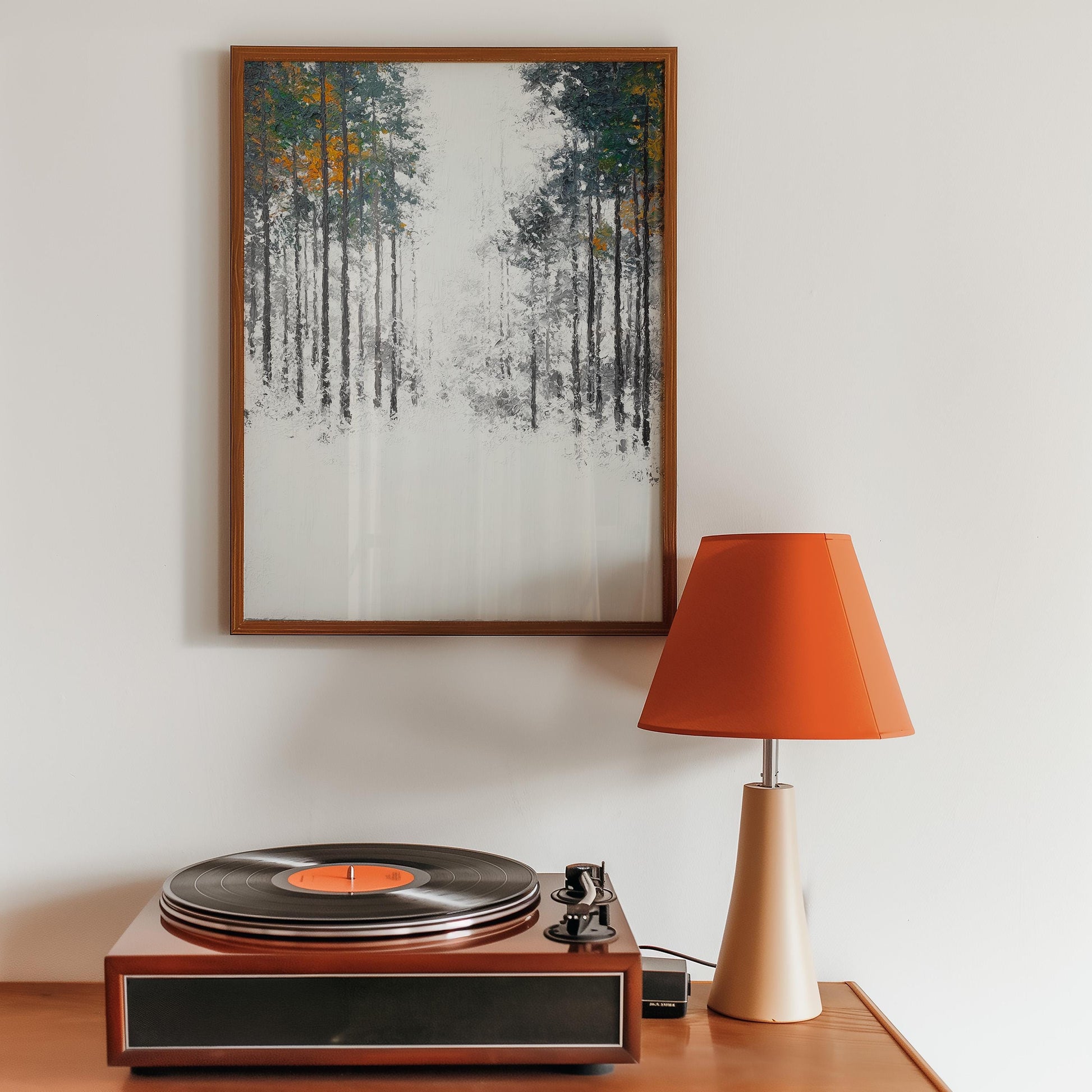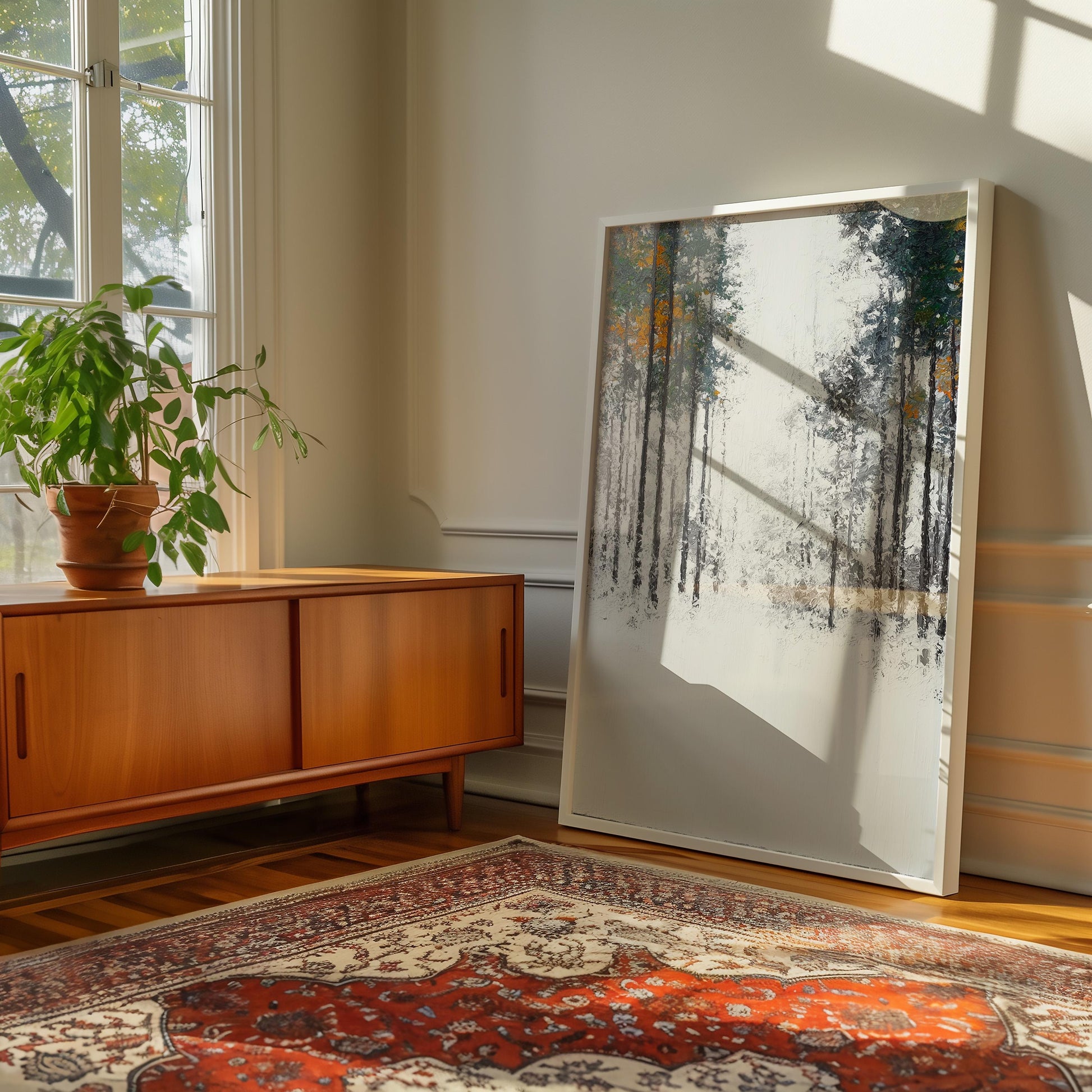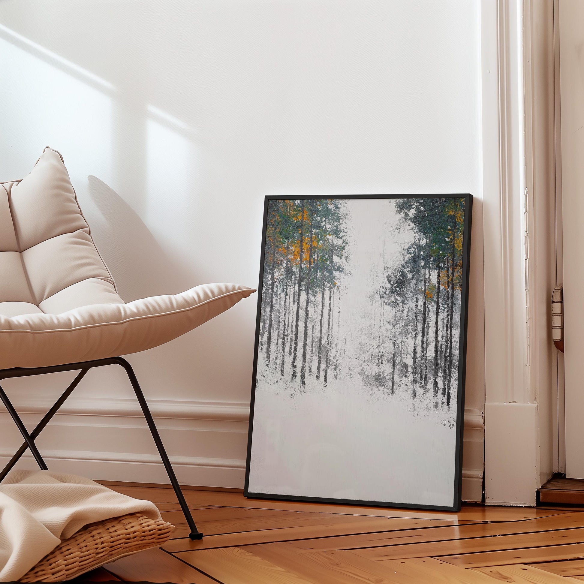 PERFECT FOR Forest path lovers, minimalist design enthusiasts, those seeking atmospheric woodland art, Nordic and Scandinavian interior styles, spaces needing sophisticated natural beauty with seasonal warmth.