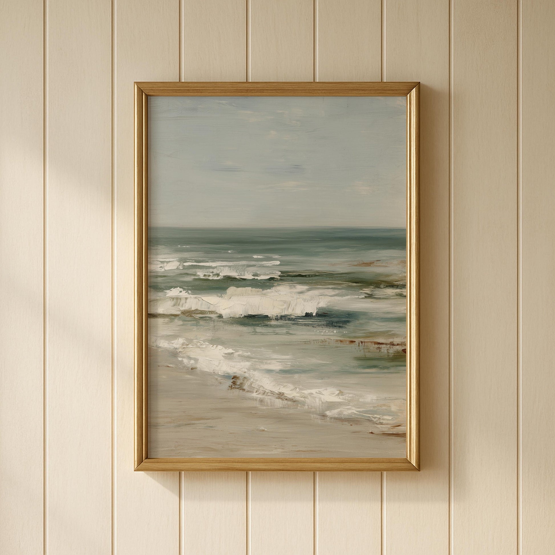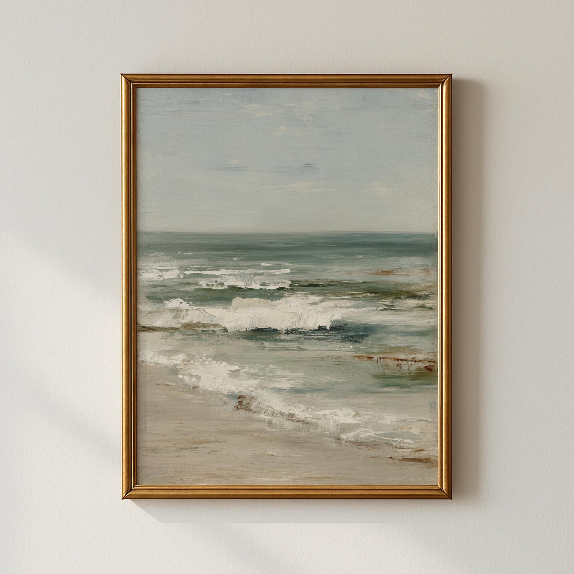 Rolling ocean waves meet sandy shore in this atmospheric seascape painting. The impressionistic brushwork captures the movement and energy of the sea while maintaining a sense of peace through its soft colour palette.