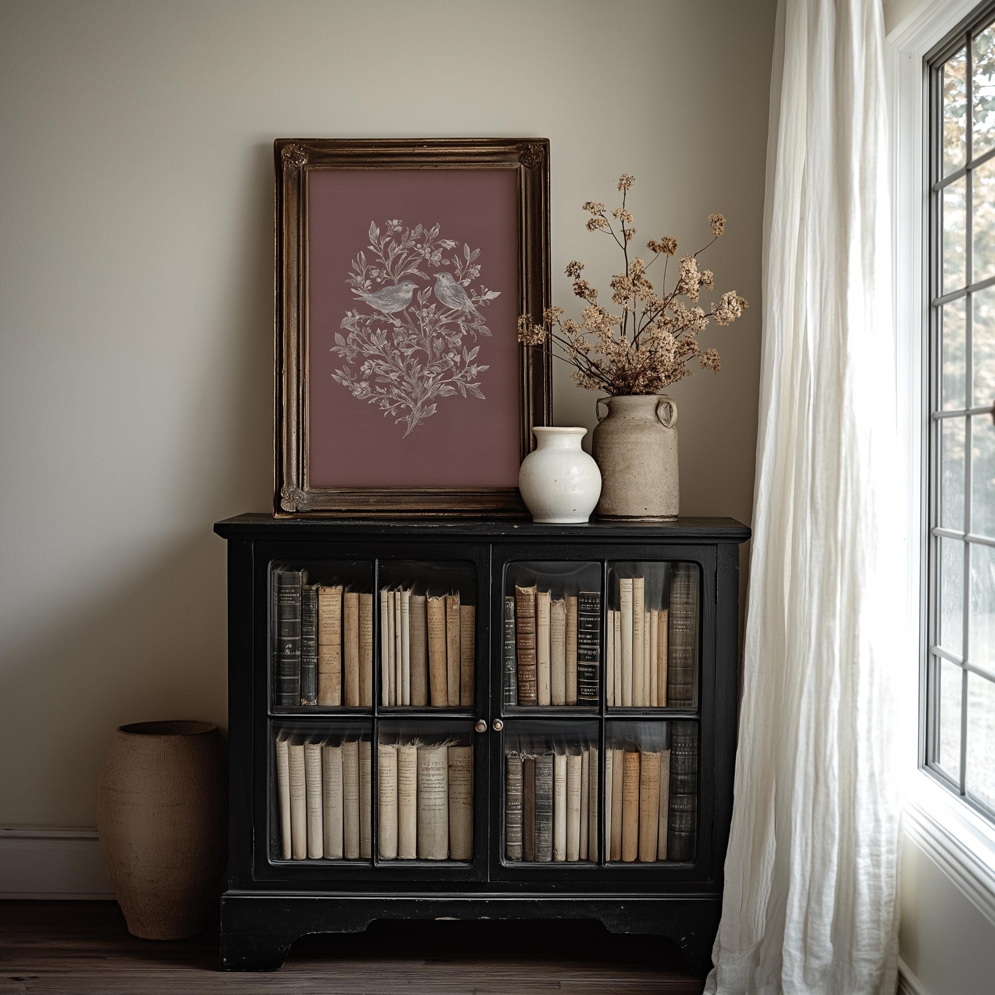 Two delicate birds perch among blooming botanical sprays in this vintage inspired illustration. The soft dusty pink background creates a romantic, timeless aesthetic perfect for creating calm spaces.