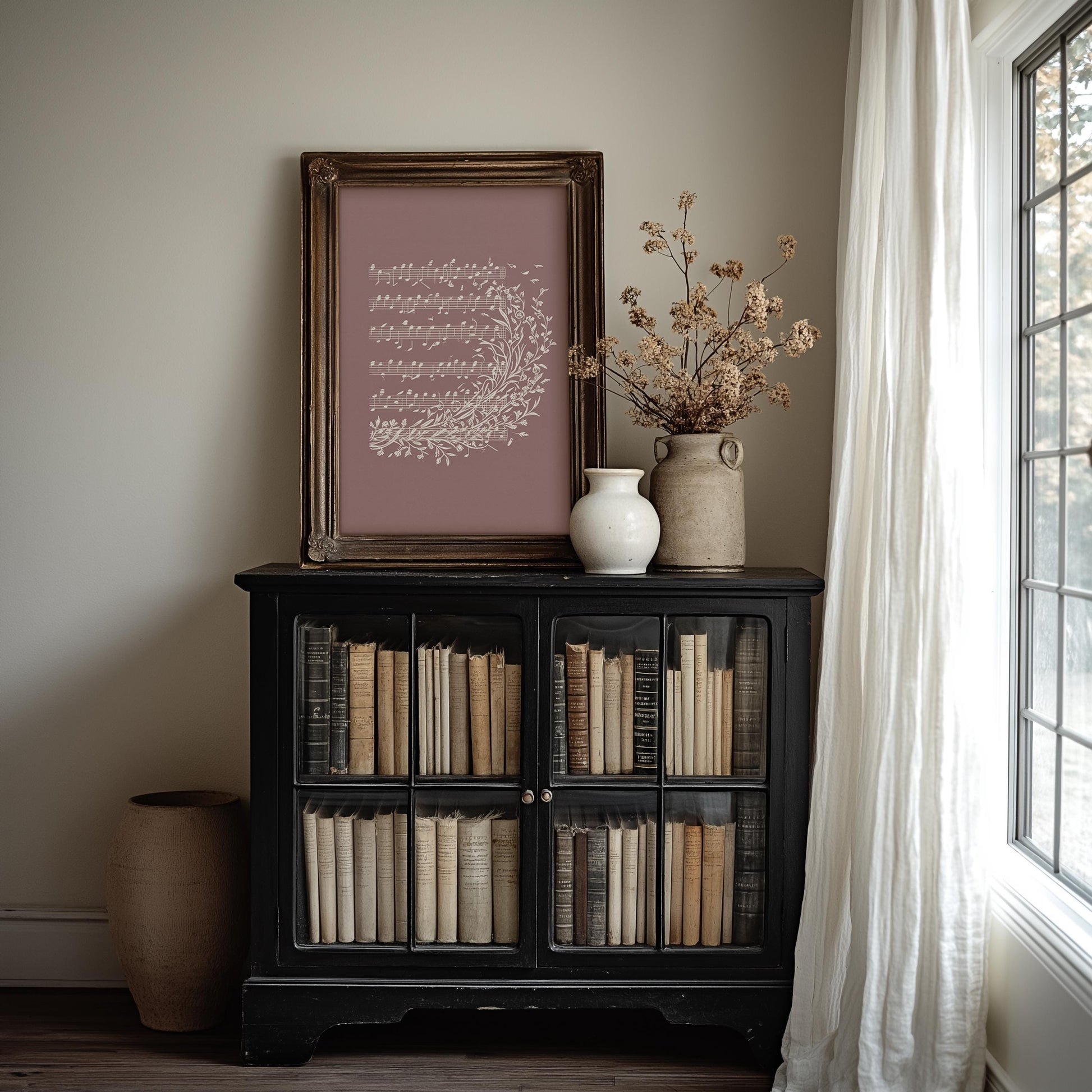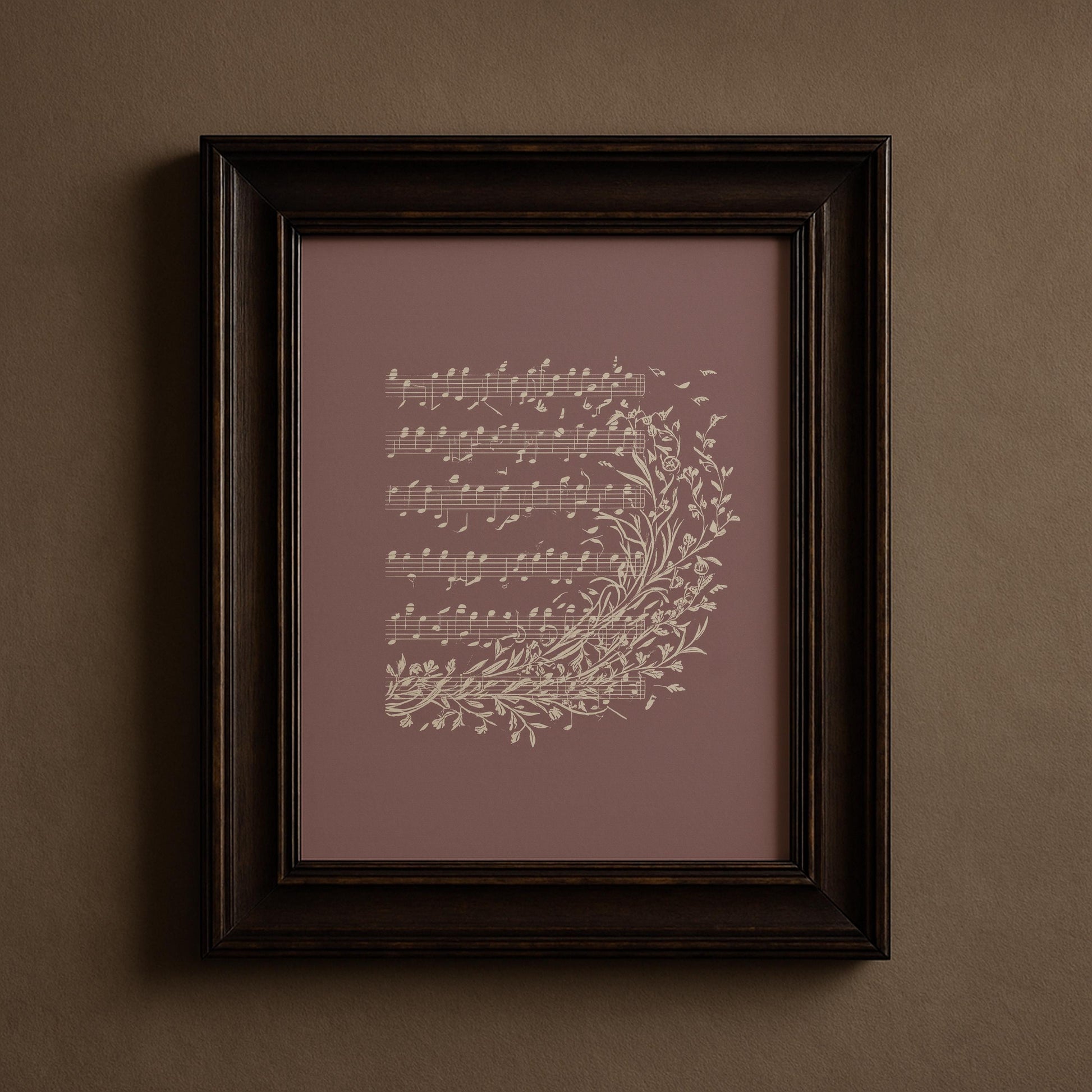 This vintage inspired wall art combines musical heritage with natural beauty. The botanical illustration intertwines with actual sheet music, creating a unique piece for music lovers and nature enthusiasts alike.