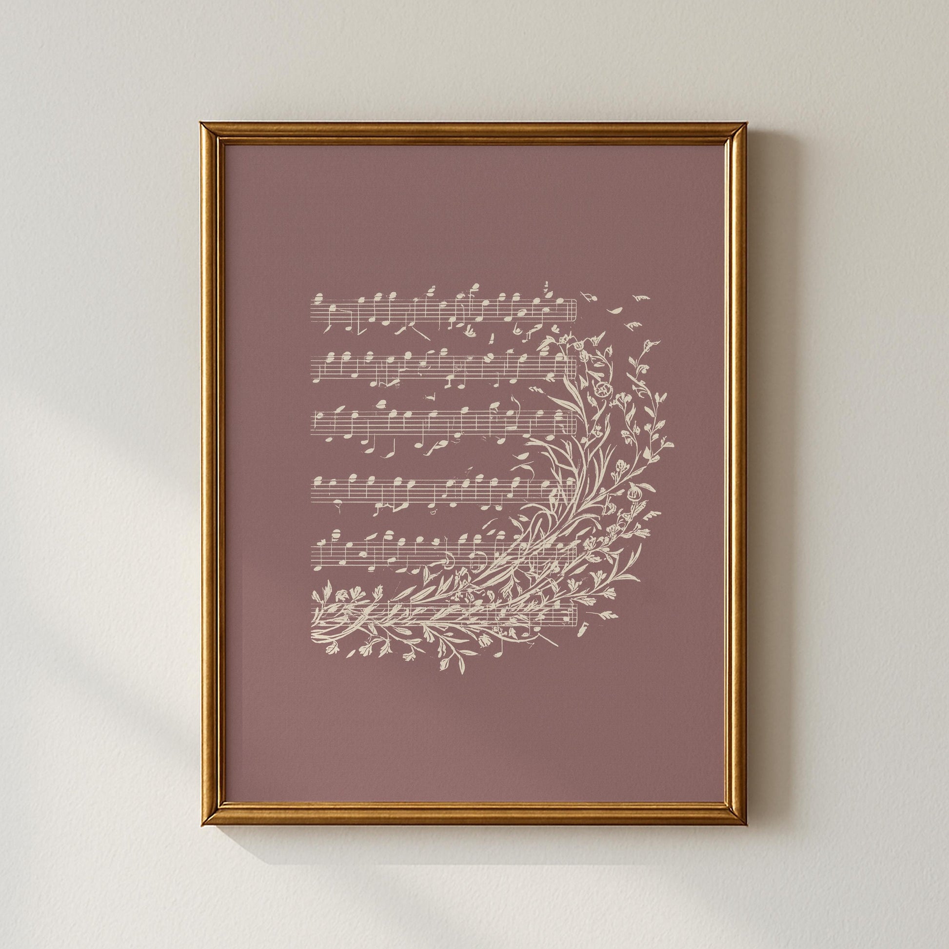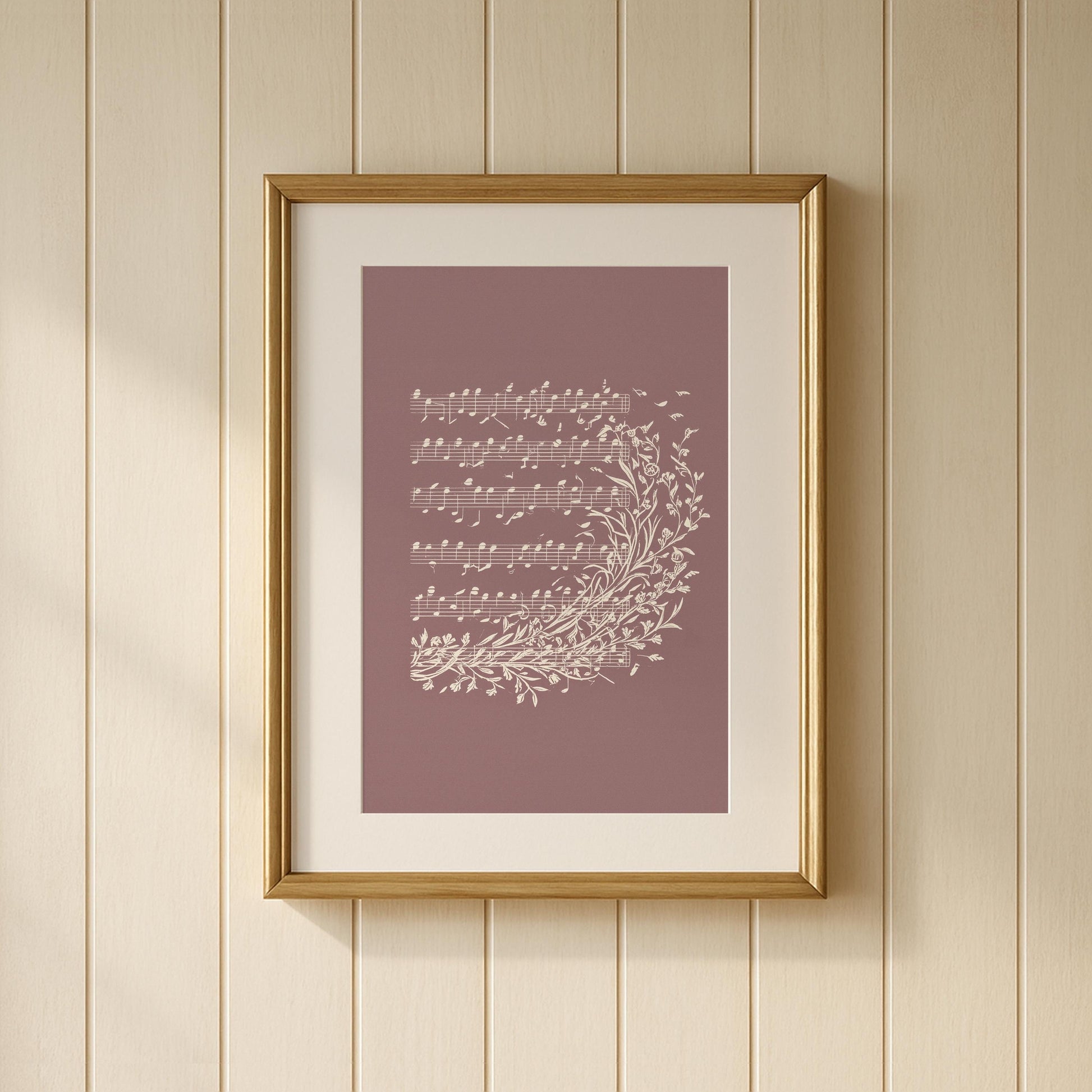 Delicate wildflowers bloom across vintage music notation in this romantic botanical print. The soft dusty pink background creates a dreamy, feminine aesthetic perfect for bedrooms and cozy spaces.